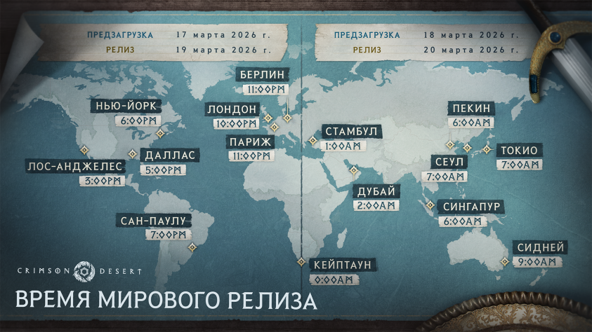 Согласно обнародованной карте, Crimson Desert стартует 20 марта в 01:00 по Москве. Предзаказавшие смогут воспользоваться функцией предзагрузки ровно за двое суток до релиза на всех целевых платформах. Напомним, за предзаказ авторы предлагают небольшой бонус в виде эксклюзивного щита Калед.